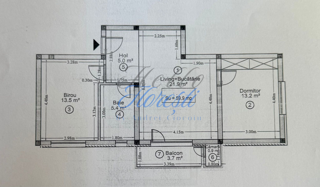 Va propunem spre vanzare apartament cu 3 camere, semidecomandat, in Floresti, zona Cetatii. Proprietatea dispune de o suprafata utila de 59.9 mp si un balcon de 3,7 mp, fiind compartimentata astfel: