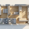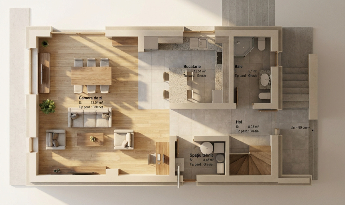 -Parter: la parter avem bucataria open space si zona de living cu loc pentru luat masa si acces pe terasa