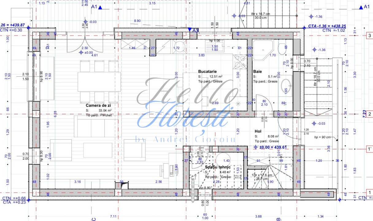 Va propunem spre vanzare o casa individuala cu 4 camere in Tauti, Cluj. Aceasta dispune de o suprafata utila de 120mp, suprafata terenului fiind de 300mp dintre care 70mp este amprentra la sol, ceea ce inseamna ca avem o suprafata de teren liber de 230mp. Compartimentarea casei care dispune de un regim de inaltime P+1+pod este urmatoarea: