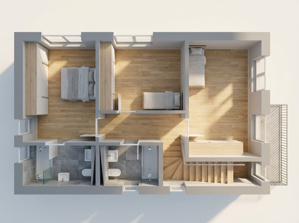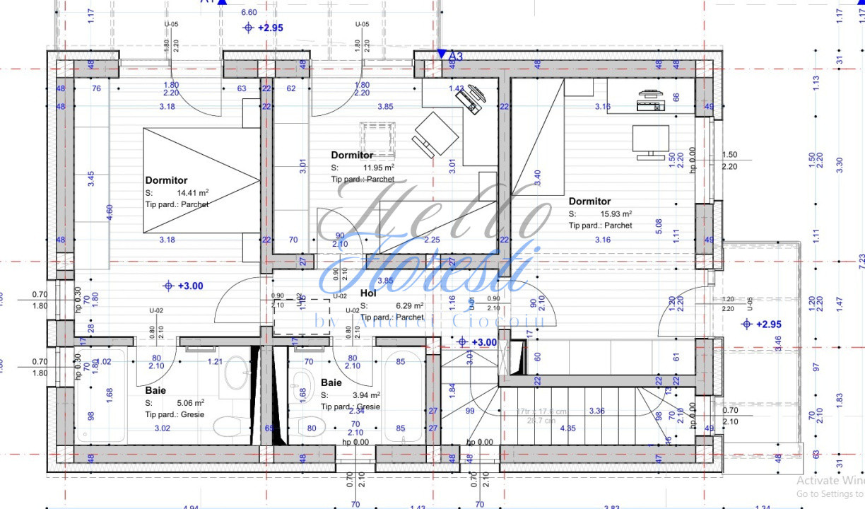 -Etaj: la etaj avem 3 dormitoare, iar dormitorul matrimonial este cu baie privata si acces la balcon